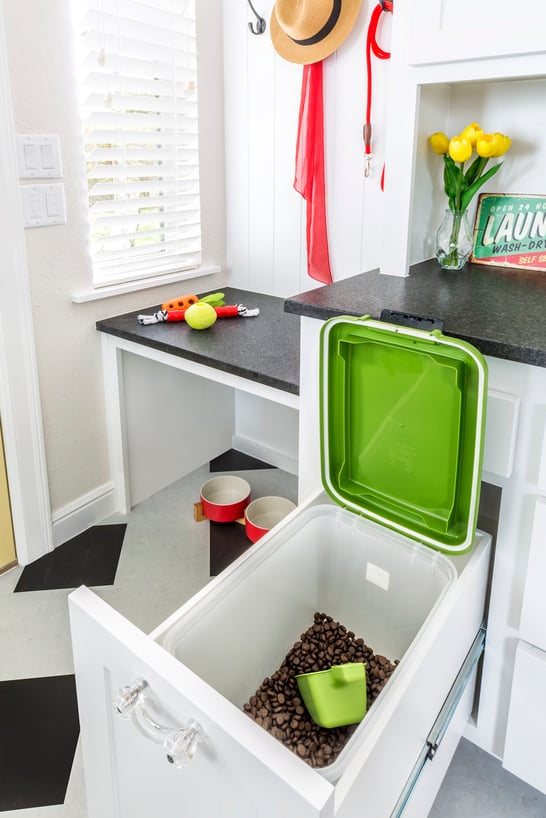 Inside the largest drawer is a food bin roll-out. This convenient feature makes feeding the dog and refilling the bin incredibly easy, and keeps the kibble out of sight.