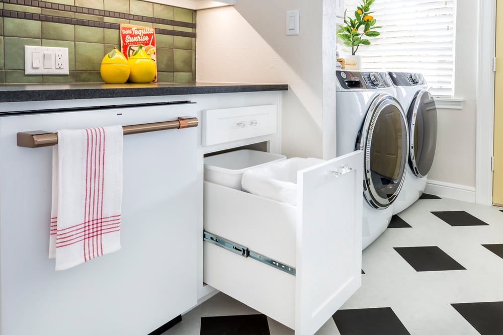 Just beside the stunning Café brand dishwasher is a sleek roll-out trash bin. We often take for granted how neat this feature is (we install one in nearly every kitchen we remodel) but it truly does make for a cleaner, more organized kitchen. Who wants a trashcan sitting out when it can be neatly tucked away in a convenient cabinet drawer?