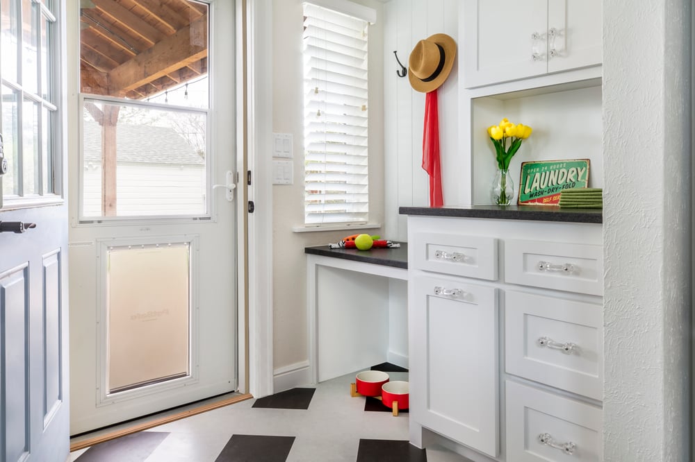 Of course, it wouldn’t be a true doggie station without the extra-large dog door that we installed in the storm door so the pup can go in and out as he pleases!