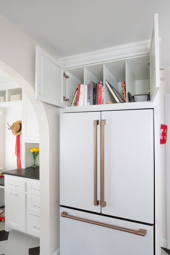The cabinets above the fridge were sized to hold cookie sheets, muffin trays, cookbooks, and more. The crown molding at the top offers that custom, built-in look the client was hoping for, while taking advantage of vertical space.