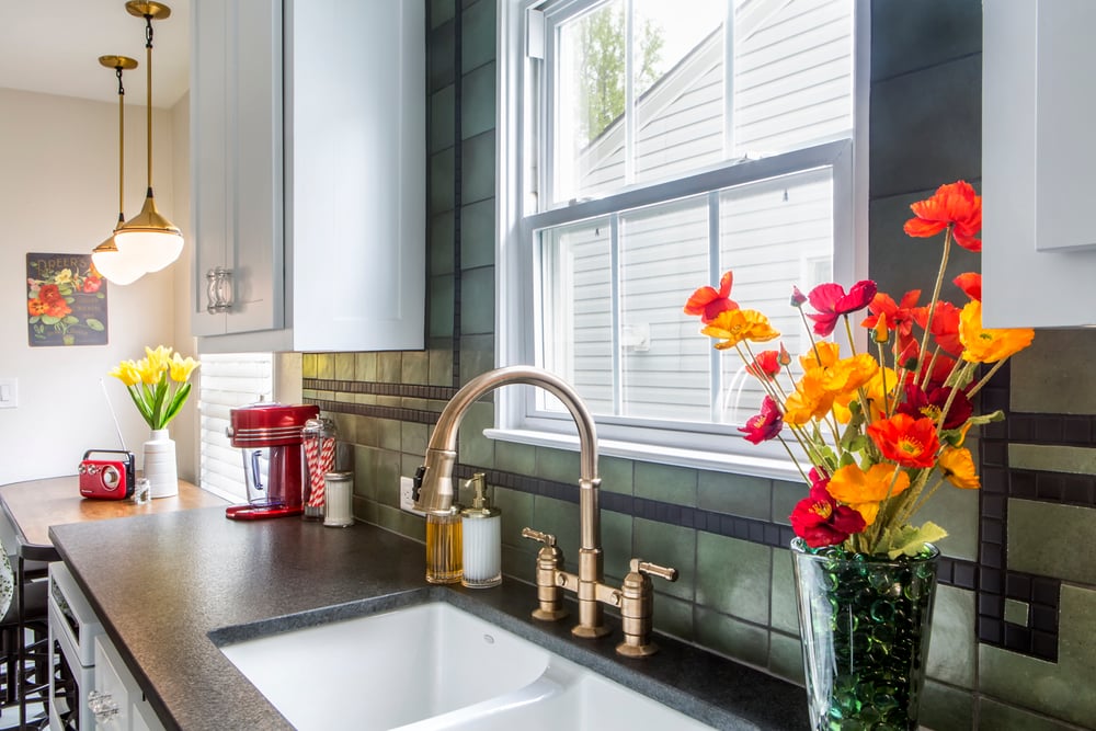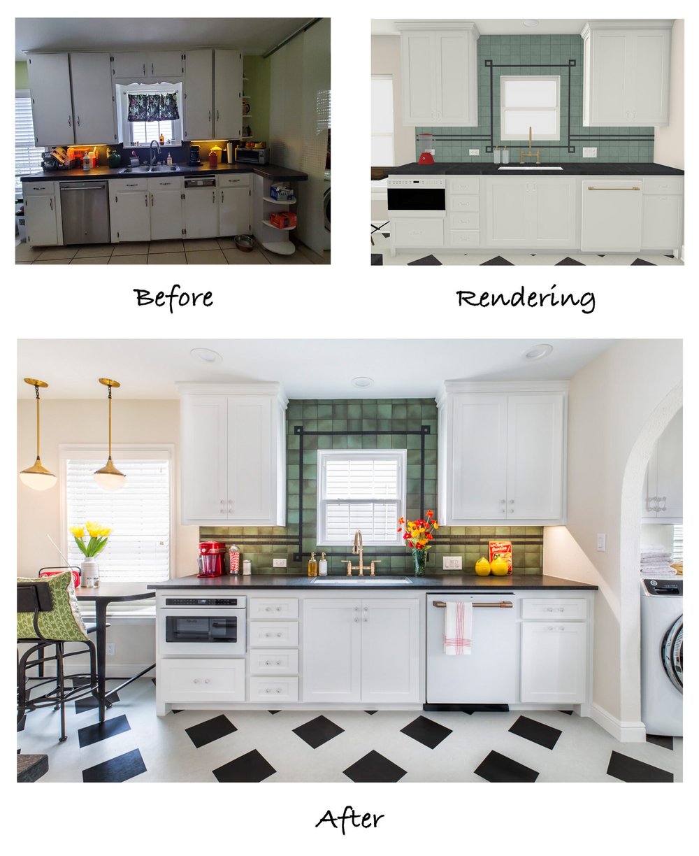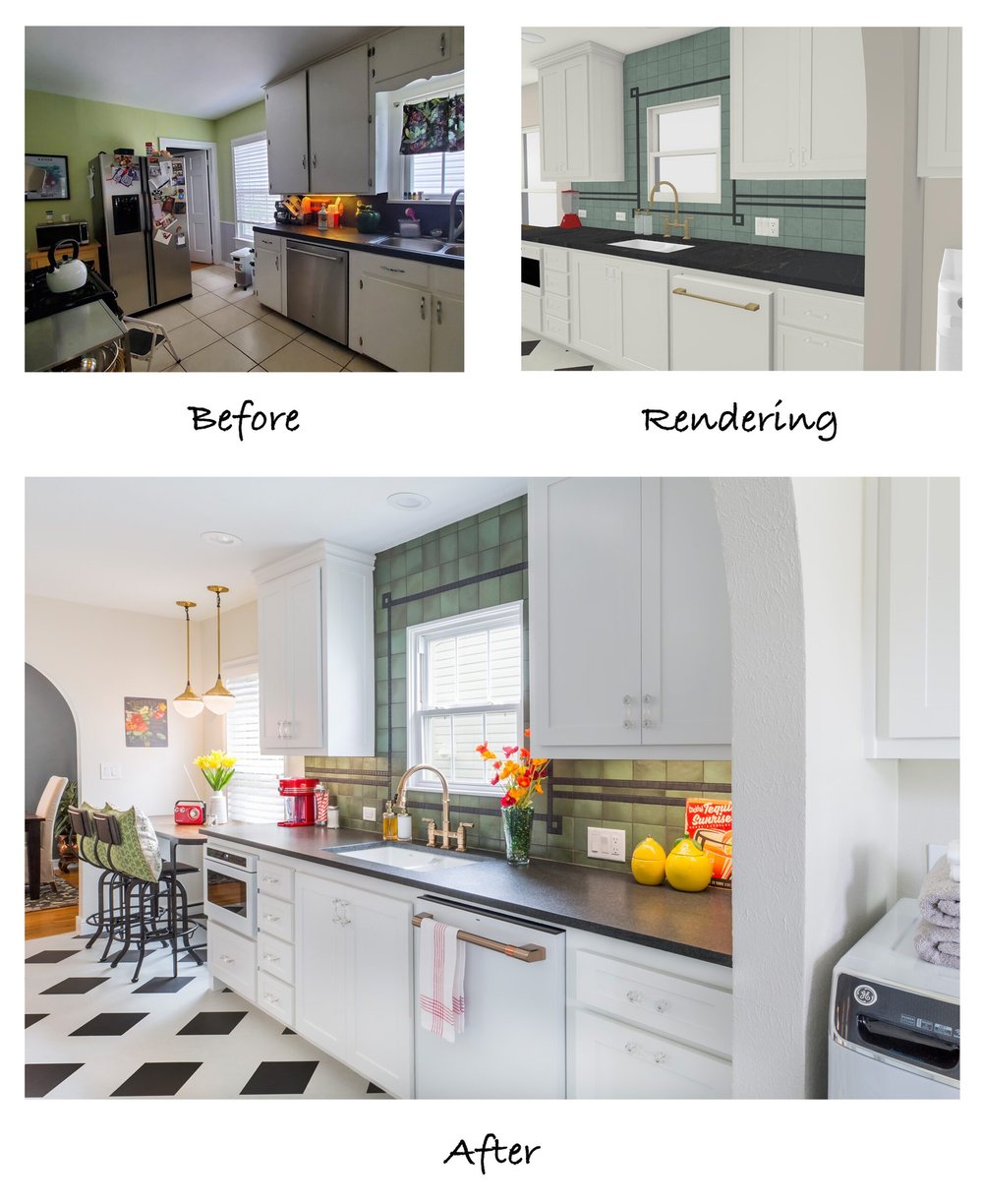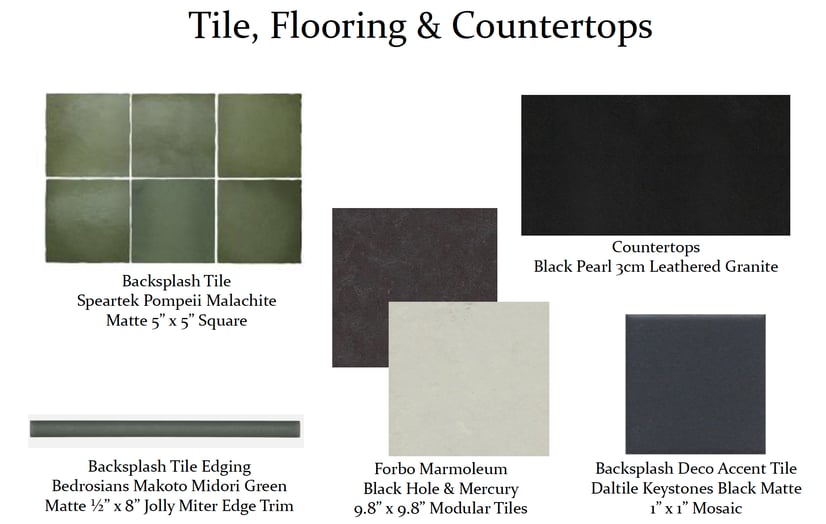 The green backsplash tile is the star of this space and was selected to reflect the 1940’s character discussed at the initial design meeting. The black accent deco tile ties in nicely with the black leathered granite countertops and checkered modular tile flooring.