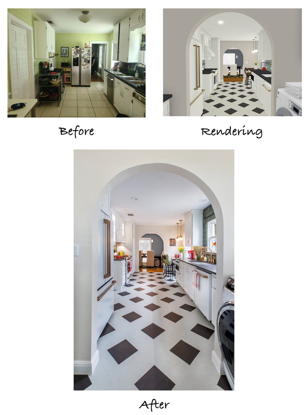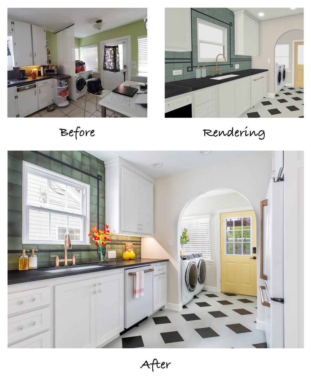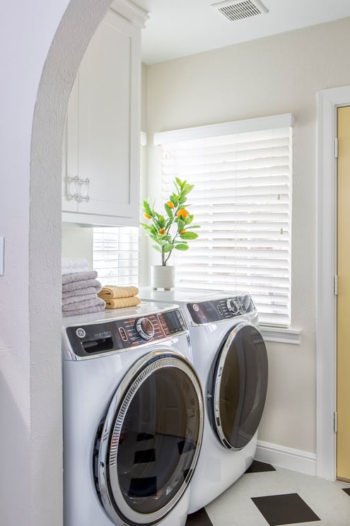 One of the first things you’ll notice upon entering the remodeled space is the arched doorways that were added at each end of the room. Not only does this give a polished aesthetic, but also creates the needed division between the laundry area and kitchen. It is nice to have a sense of separation without the requirement of an actual door in such a small space.