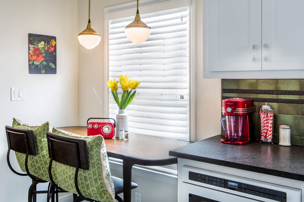 The table and stools look as though they were made for this space; the client was so happy to finally have a table and chairs in her small kitchen! The retro-style pendant lights and old-school accessories give the feel of a classy diner of that era.
