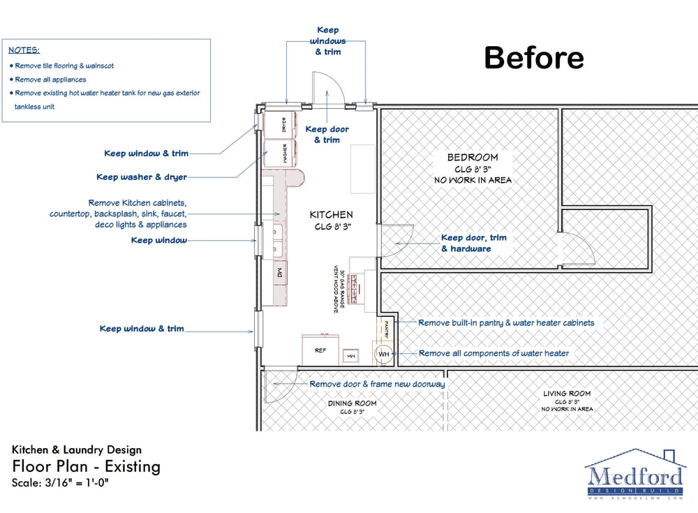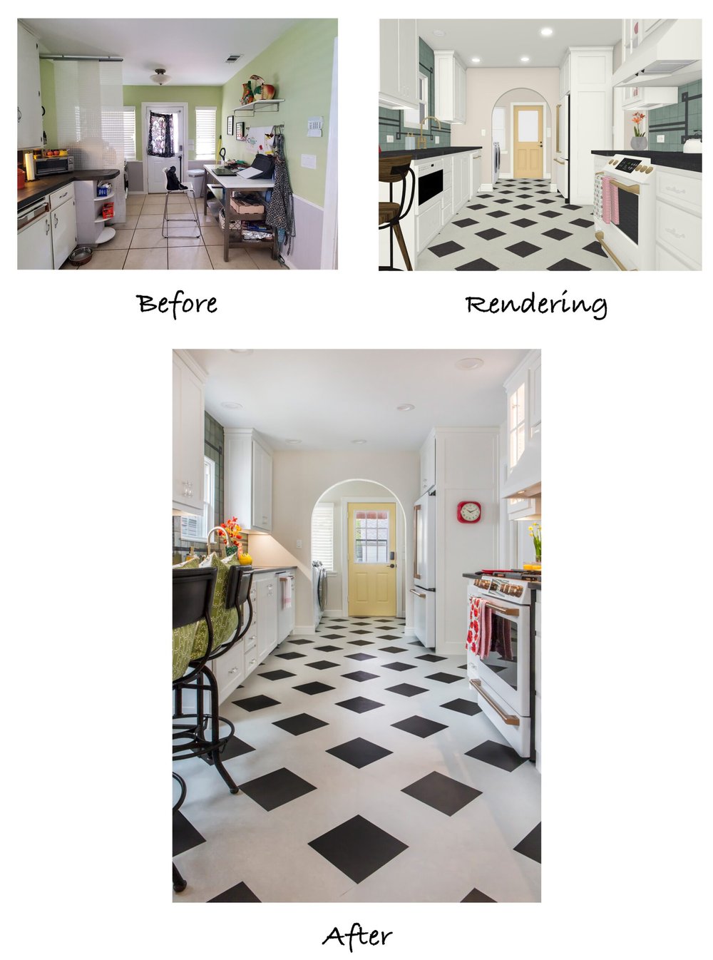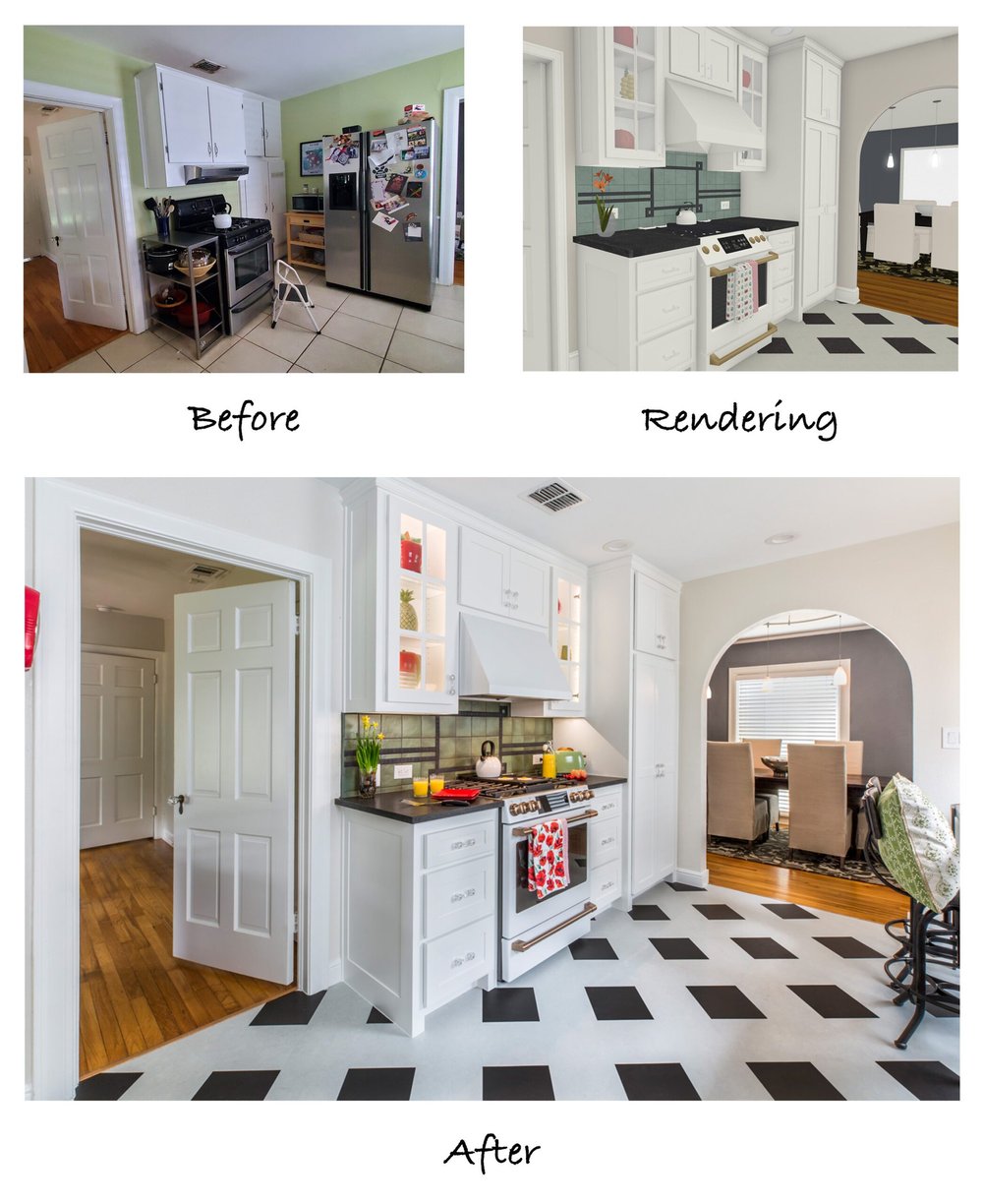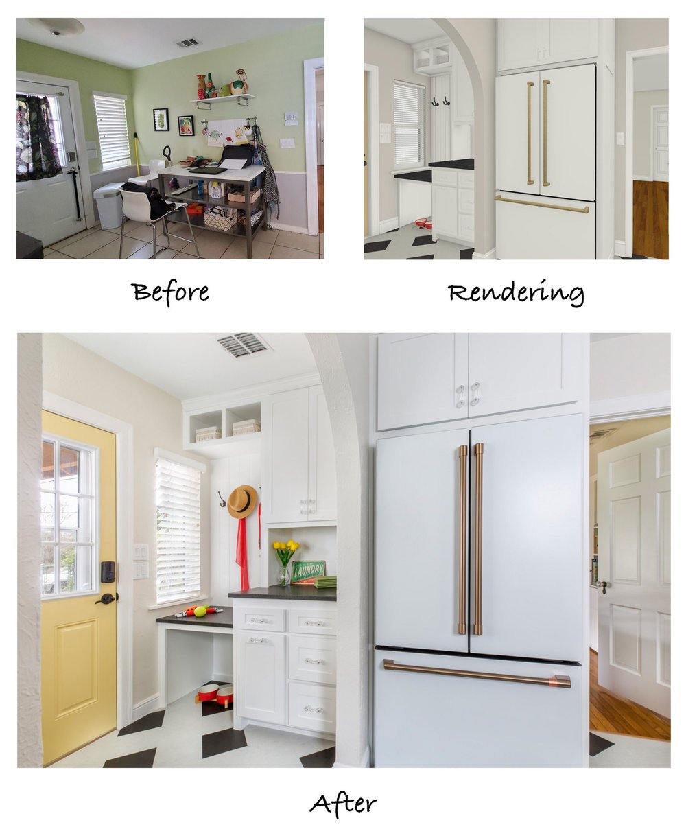 Due to the surrounding rooms and layout of the house, moving walls to change the footprint was not an option. Our designers were, however, able to put together a cohesive floor plan that involved relocating the refrigerator and installing more cabinetry. The before and after floor plans showcase these modifications: