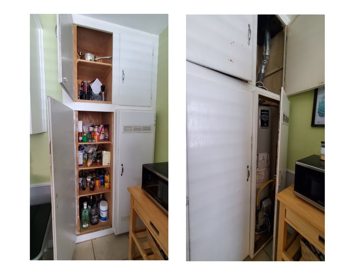 Along with the dated look, the original kitchen lacked one very important feature – storage & counter space! There were only a few upper cabinets and one pantry cabinet, which was mostly occupied by the water heater. The 6 small shelves to the left of the tank were really the only substantial bit of storage in the entire kitchen.