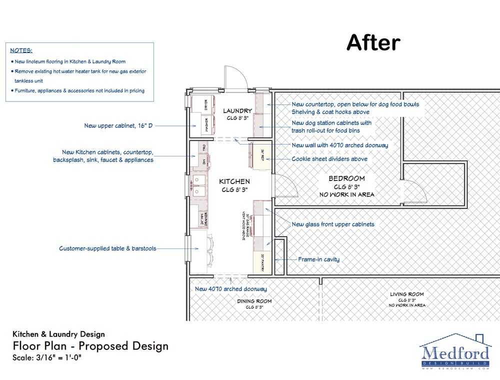 Relocating the fridge freed up some space for the doorway to the dining room to be moved over, creating just enough room for a table and stools – something the client was hoping for! Along with the built-in cabinetry around the new stove and fridge, the laundry area at the end of the kitchen was also remodeled as a part of this project. Our client loved the idea of having the area separated from the kitchen and customized with a counter and storage space for dog supplies. With the client on board and excited to proceed, our team got to work creating this project.
