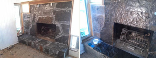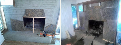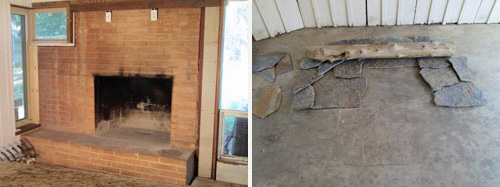 Remodeling traditional brick fireplaces is one of our favorite projects to do. They can be transformed in so many ways, the possibilities are endless, and the results are usually stunning. For this fireplace, we used salvaged rustic stone and a cedar log for the mantle, providing for a rugged, masculine finish.