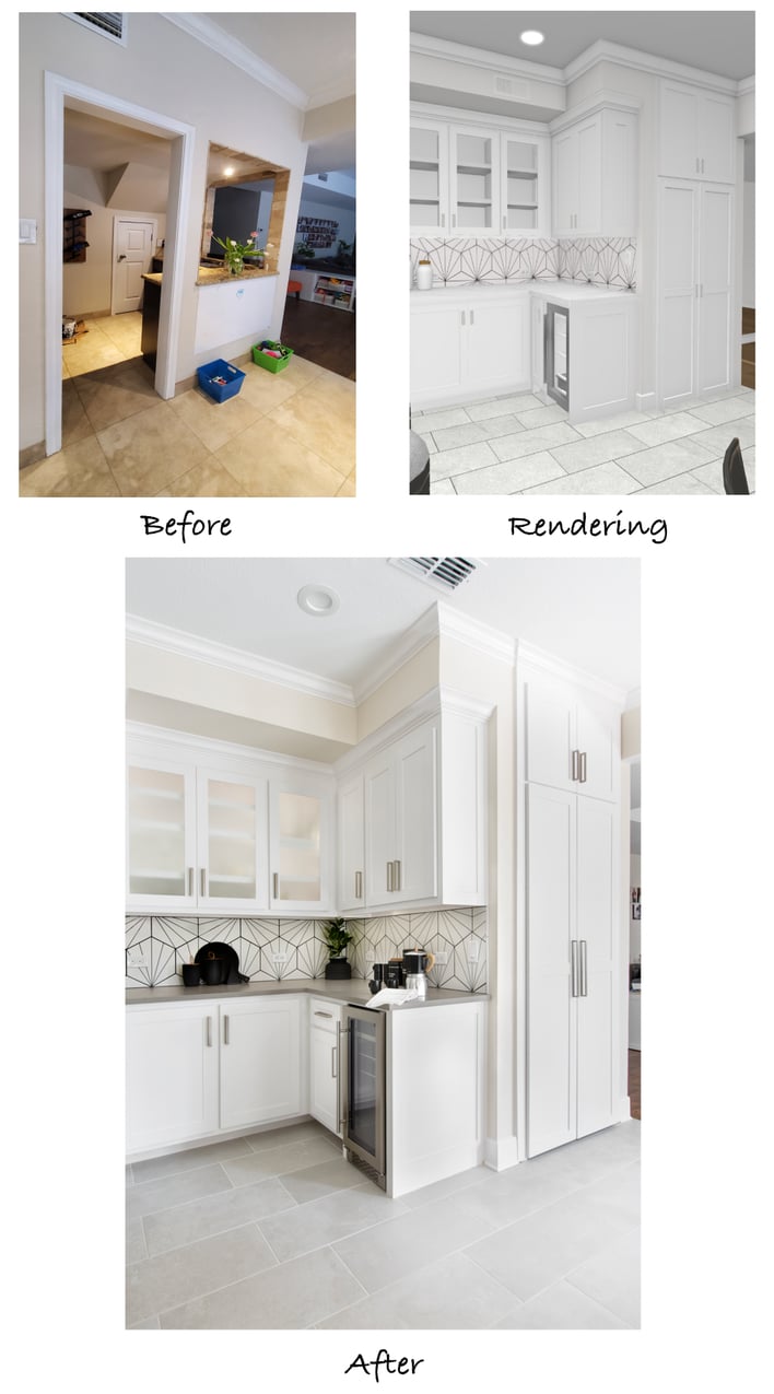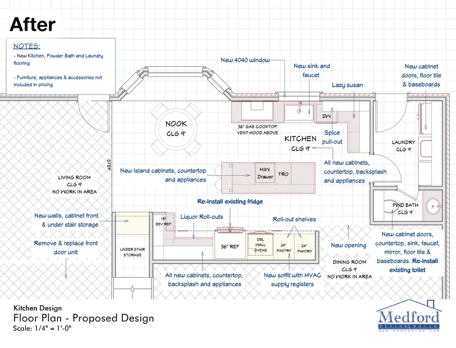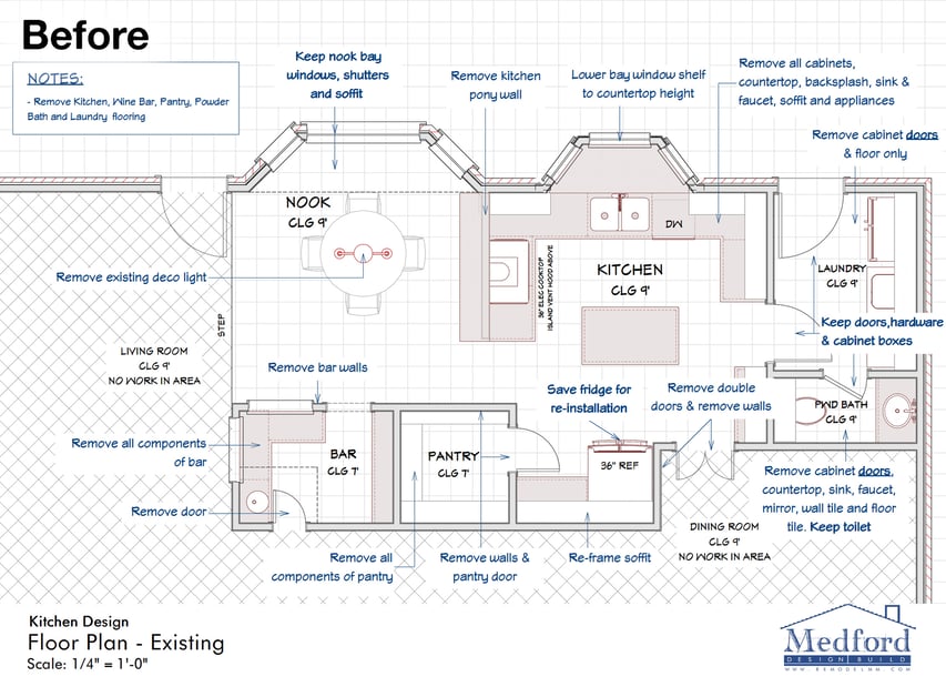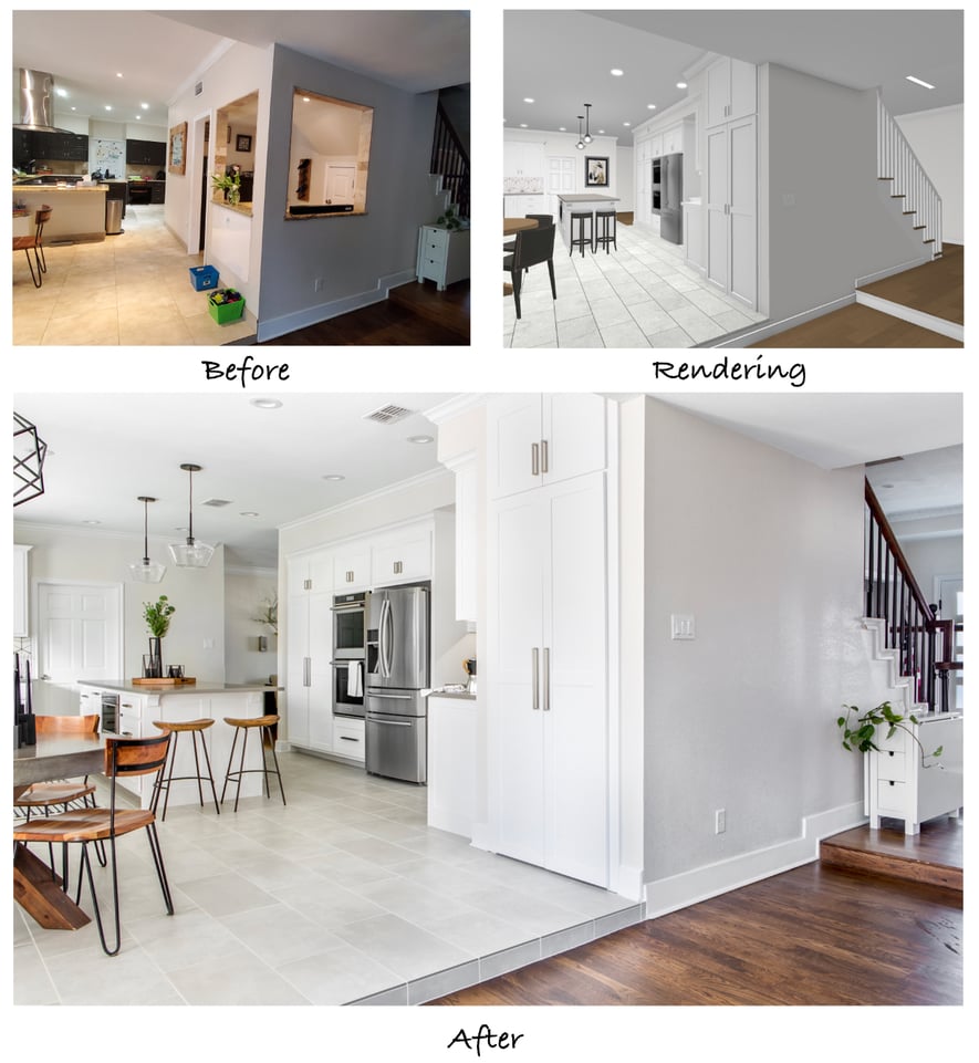 The floor plans were especially helpful in communicating the structural changes in regard to an existing walk-in pantry and bar area that were to be removed. Initially, the clients intended to leave these areas there, but doing so would require them to be updated with new cabinets, paint, and countertops to match the new kitchen. After going through a few different layout options, the decision was made to fully demolish these areas, allowing for additional counter and storage space in the kitchen and a much needed under-stair storage closet in place of the bar.