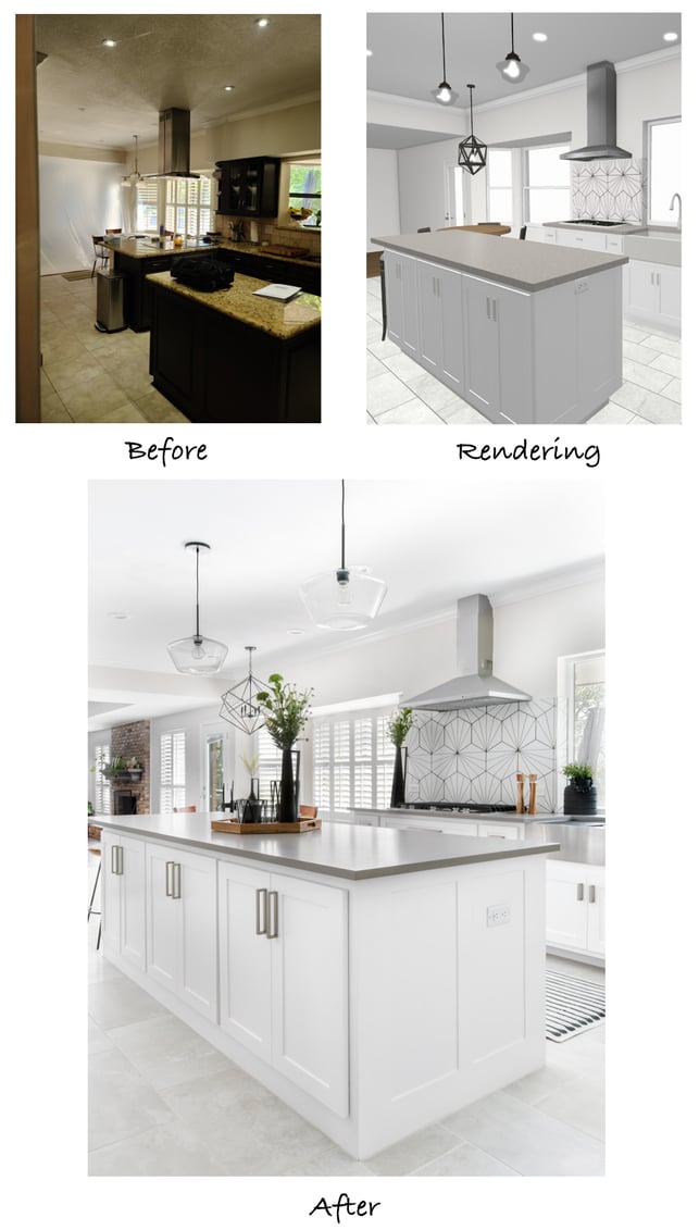 The placement of the cooktop and vent hood were a big topic of discussion regarding the updated layout. Our designers initially had them located on the opposite wall where the refrigerator now sits, but the clients preferred them on the same wall as the sink. We modified the plans to show this revised set up and the clients loved it! The final location is exactly what they wanted.