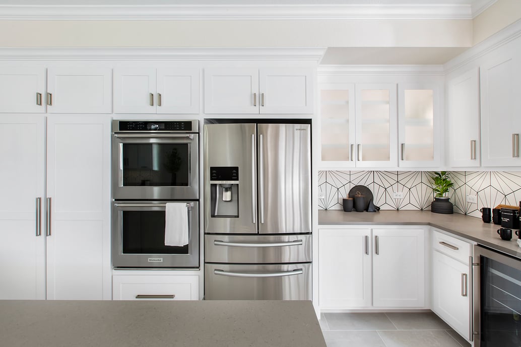 Removing the walk-in pantry and the doorway to the dining room created ample space for cabinets to be installed around the refrigerator and new double wall ovens. The uniform shaker-style cabinets provide a ton of additional storage and create a custom, built-in look.
