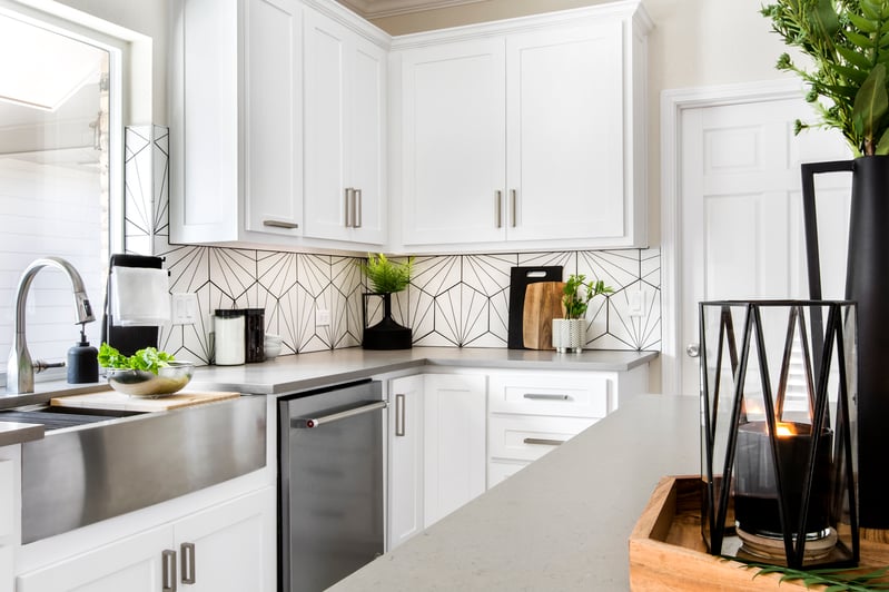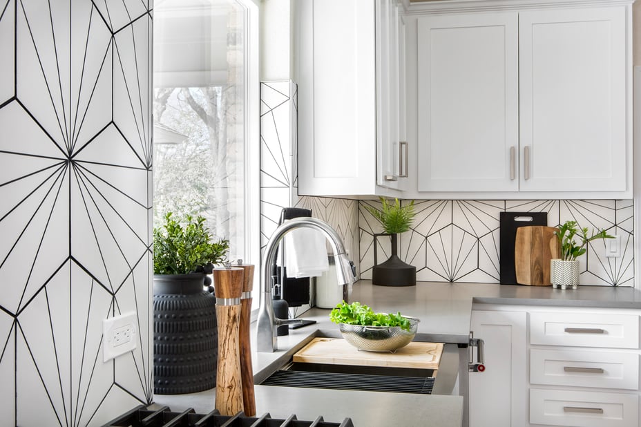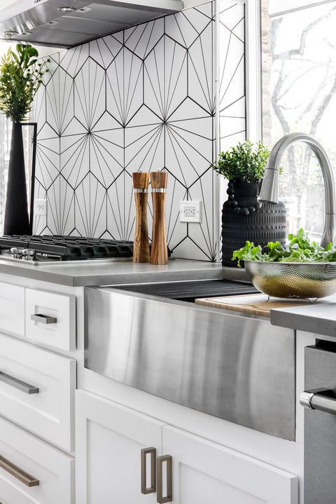 The modern black and white porcelain backsplash tile plays with geometric shapes and lines, creating visual interest and a sense of personality. Our team loves the black and white color scheme with the accents of woodgrain and stainless steel.