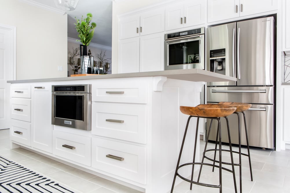 The island also provides extra storage space with deep drawers, a concealed roll-out trash bin, and a sleek under-counter microwave drawer. Our team loves this appliance as a modern option to a standard microwave.