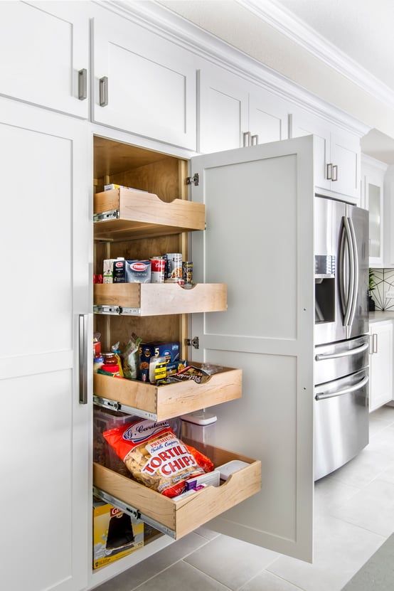 Side-by-side 24” pantries to the left of the ovens house a total of 8 convenient roll-out shelves for easy access and organized storage. Upper cabinets are ideal for storage cookware, cookie sheets, and muffin tins, while a deep pan drawer was installed just below the bottom oven.