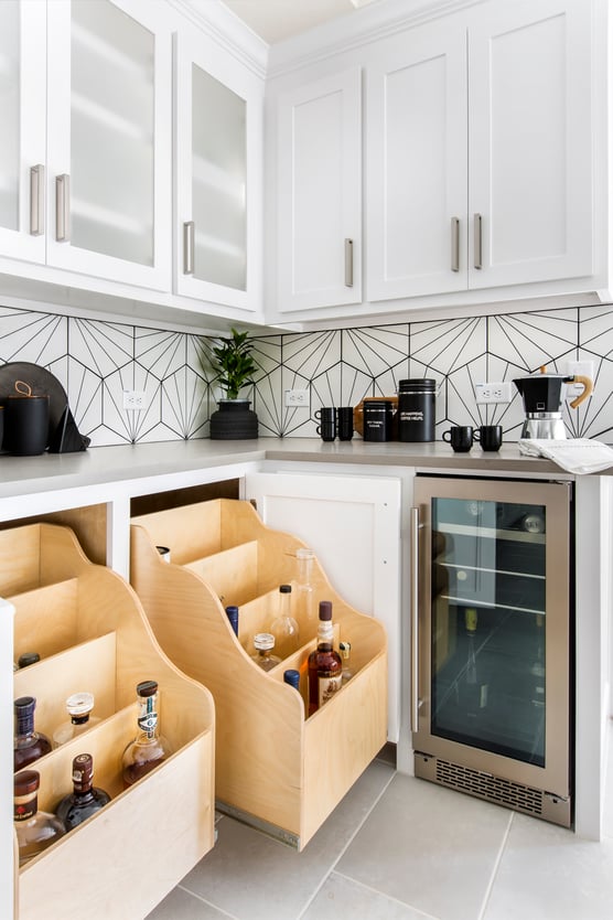 Because our clients had quite the liquor collection, it was important to them that the new kitchen included a designated storage place for the bottles. These custom roll-out drawers were designed with 4 divided levels so multiple bottles could be easily organized and accessed. They are conveniently concealed behind lower cabinet doors, just beside the wine cooler and coffee bar – a dream beverage center!