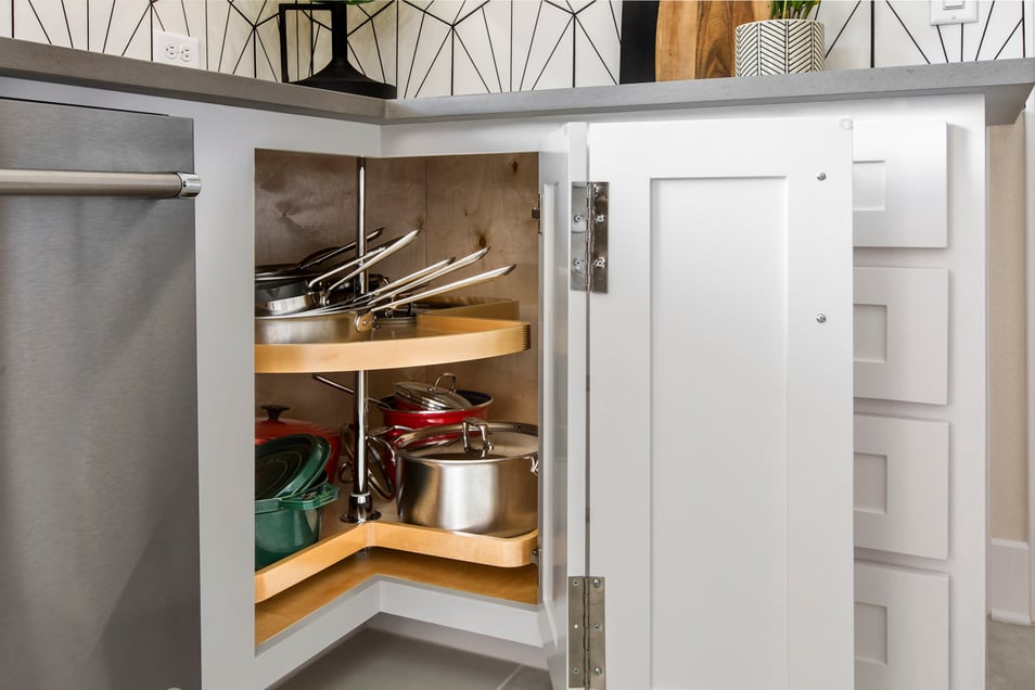 The left lower corner includes a lazy Susan to take full advantage of the corner storage space.