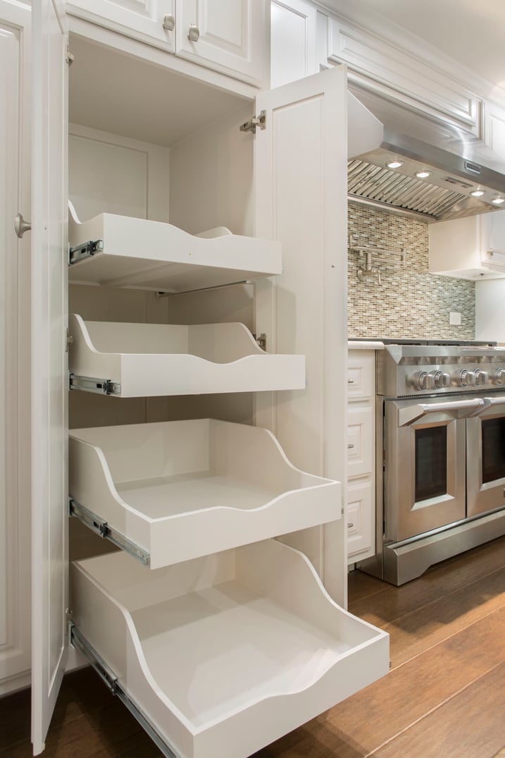 Our designers are always trying to optimize available space. Removing the original stacked ovens allowed for additional pantry storage. The new pull-out shelves were designed in multiple sizes and installed at varying heights for ease of use.