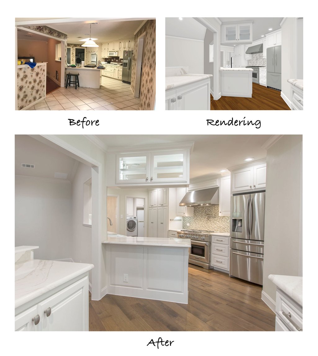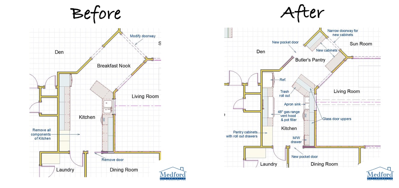 The main structural difference you can see in the before and after floor plans is the addition of cabinetry in the breakfast nook, converting the space into a butler’s pantry. Along with updating the existing cabinets throughout the kitchen, our designers included new upper cabinets above the peninsula and pass-through window. These changes don’t appear to make much of a difference to the floor plan, but they make all the difference in the world within the finished kitchen!