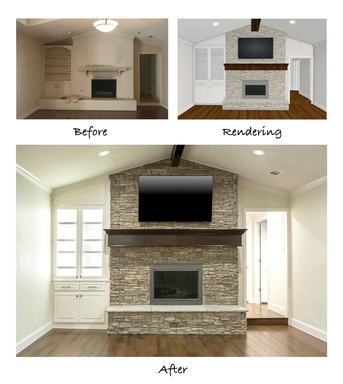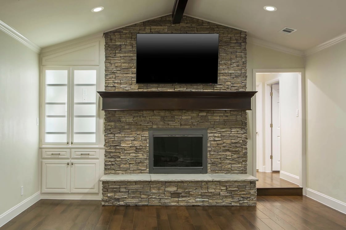 The smaller living space on the opposite side of the kitchen also featured a fireplace that needed refreshing. Both the clients and our team wanted to keep a consistent, uniform look across the house, so the den renovation included all of the same materials used in the main living room. The same stacked stone and ledge stone were used replicated the look of the first fireplace, with the same custom mantel, finished in white.