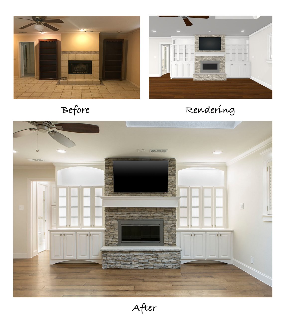 The intended focal point of the living room just off the kitchen was a dated brick fireplace. Unfortunately, it wasn’t much of a focal point, as the painted white brick, small mantel, and built-in shelves seemed to blend in with the rest of the room. Our designers brought some drama to this lack-luster fireplace by installing beautiful stacked cultured stone and a large, custom mantel. The hearth that previously reached across the entire wall was shortened, lowered, and topped with a sleek ledge stone hearth top. Shortening the length of the hearth allowed us to extend the built-in cabinets down to the floor and install two drawers above them, providing additional storage space. New adjustable shelving was installed with satin glass doors and LED backlights, creating a show-stopping display case.